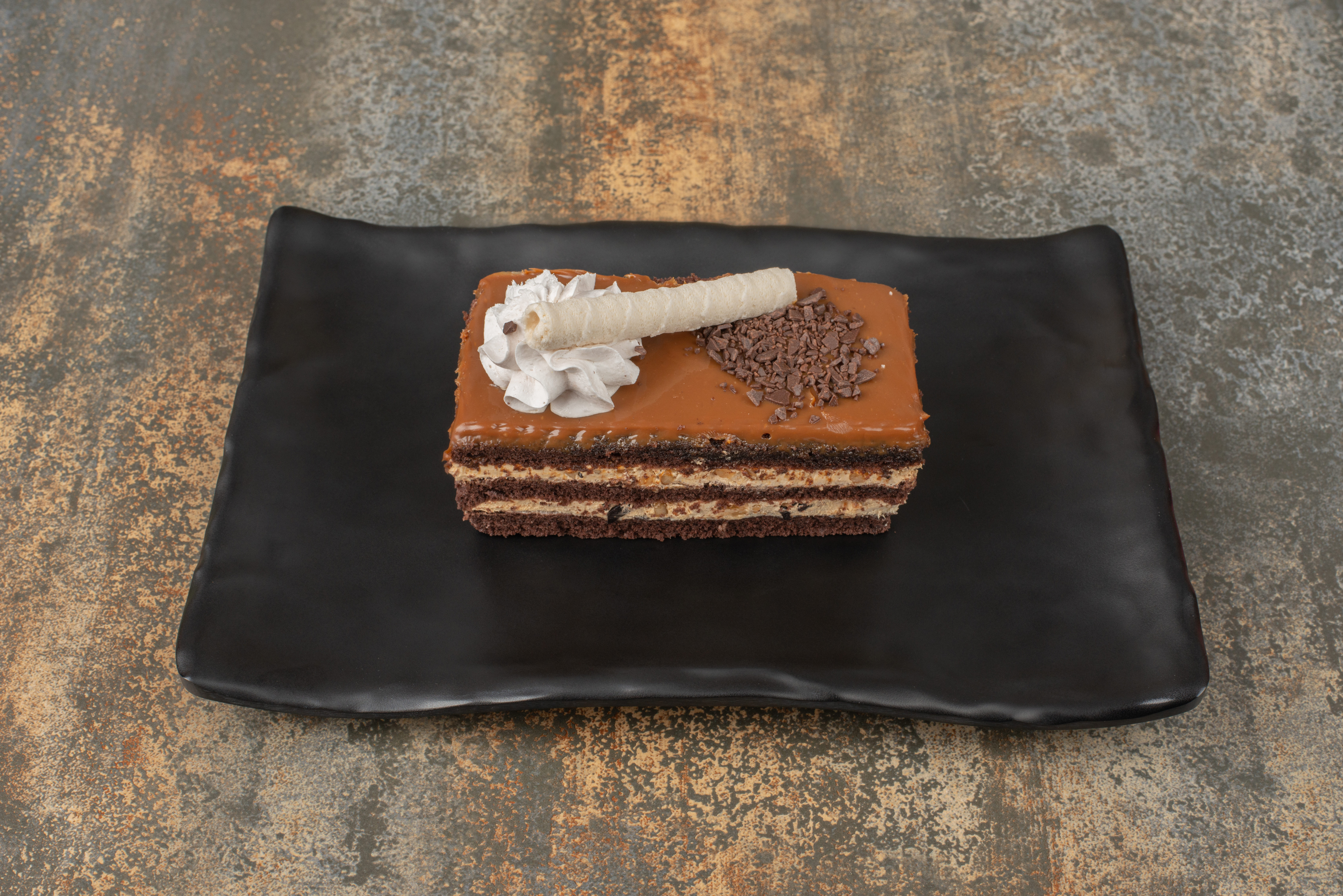 A classic French layered cake featuring almond sponge, coffee buttercream, and dark chocolate ganache, finished with a smooth espresso glaze.